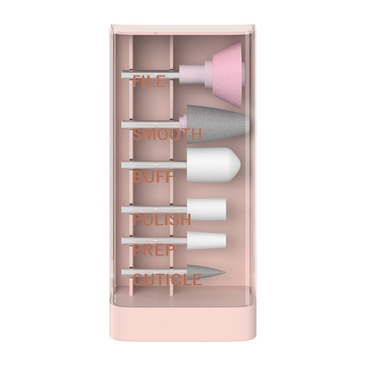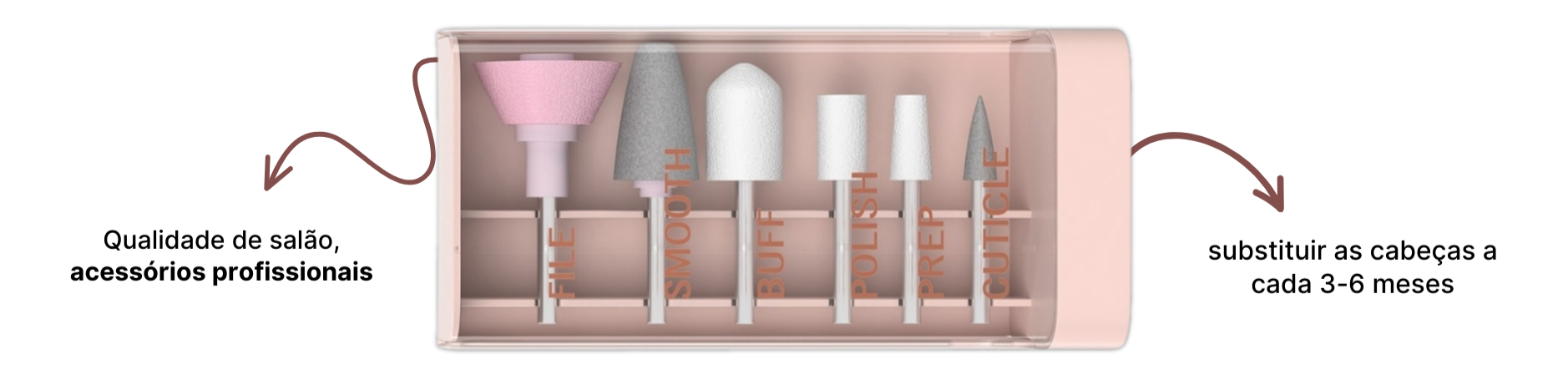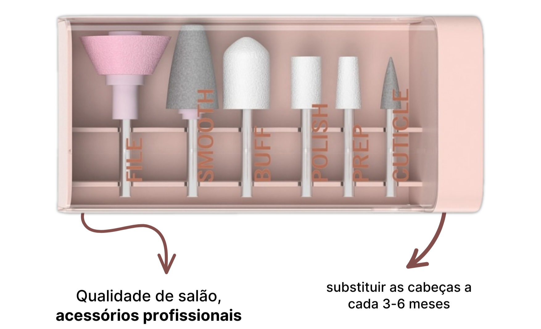 Acompanha 6 cabeças de lixa profissionais, cada uma com um formato e uma função específica para transformar seu cuidado com as unhas em uma experiência prática, segura e profissional.