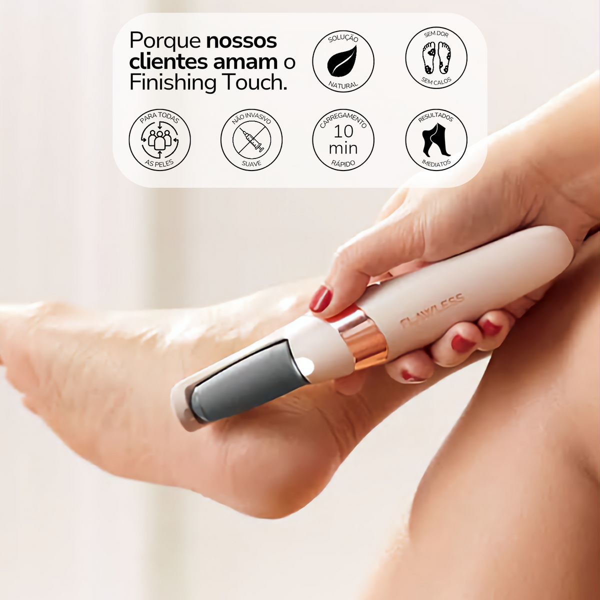 Em poucos minutos e com um investimento único, você elimina a necessidade de gastar fortunas em podólogos e sessões de pedicure que agora estão literalmente nas suas mãos.