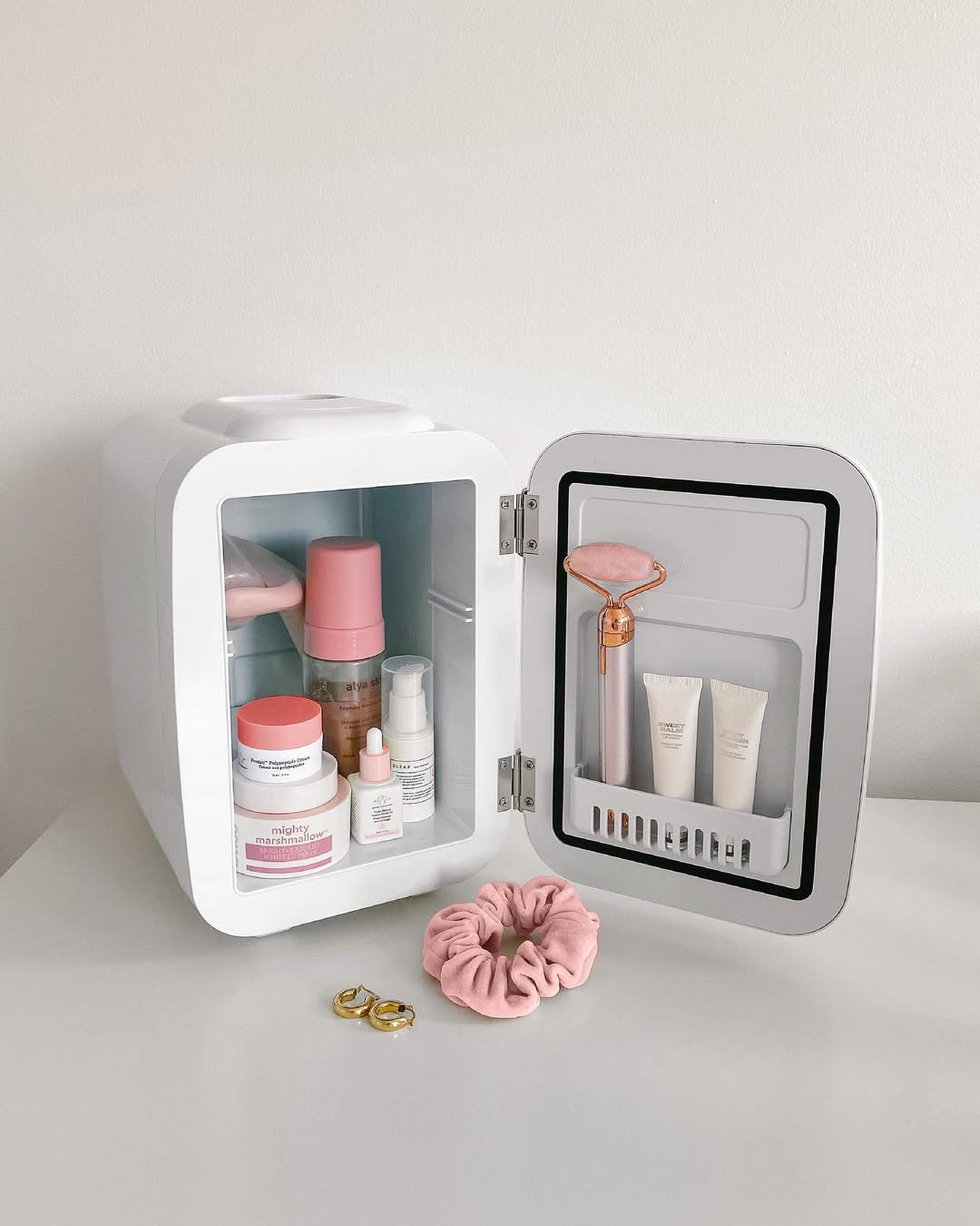 Você pode armazenar cremes faciais, séruns, máscaras, óleos, água termal e até ferramentas de skincare como rolinhos de jade e gua sha. Tudo o que você usa para cuidar da pele pode ser conservado nela!