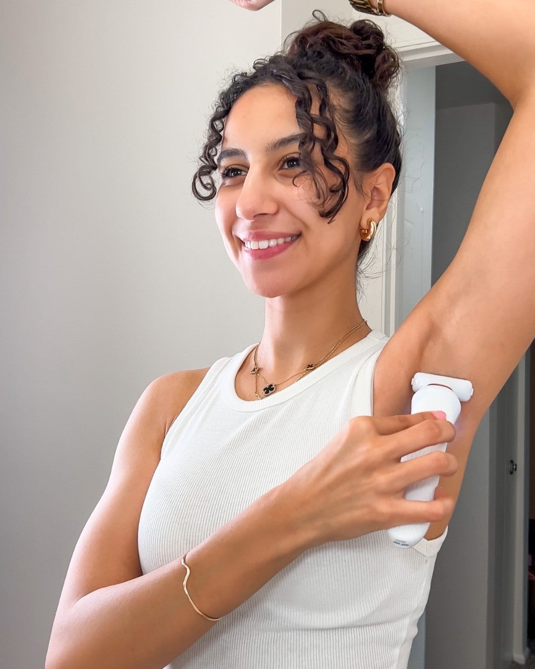 Esse depilador foi criado para resolver esse problema de forma simples. Com um design curvado que se adapta à anatomia da axila com lâminas que não tocam diretamente a pele, ele remove os pelos com suavidade sem causar irritações.